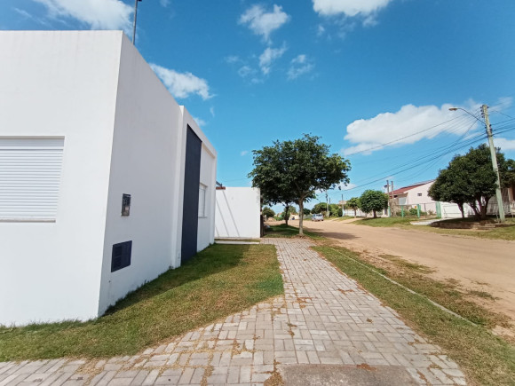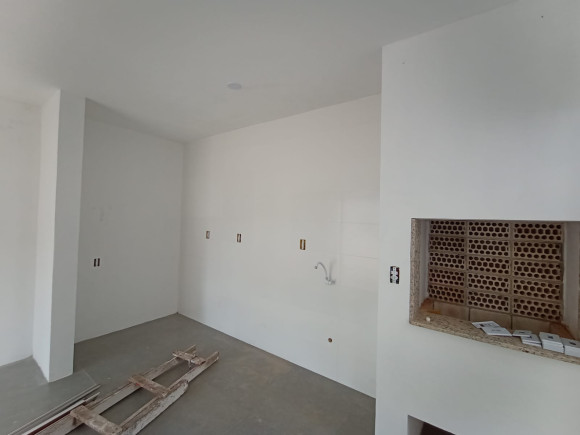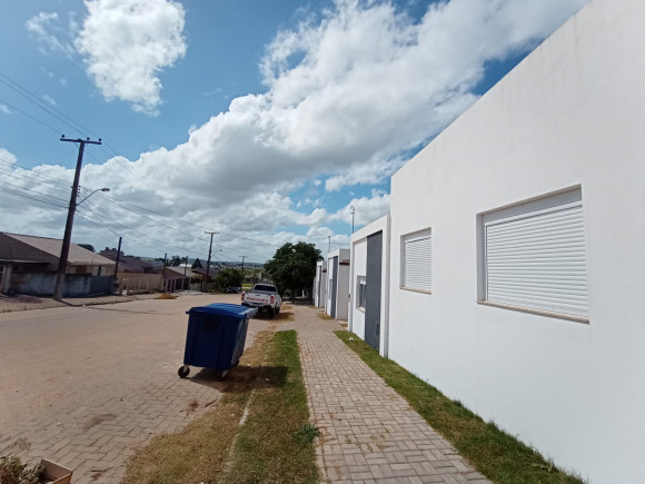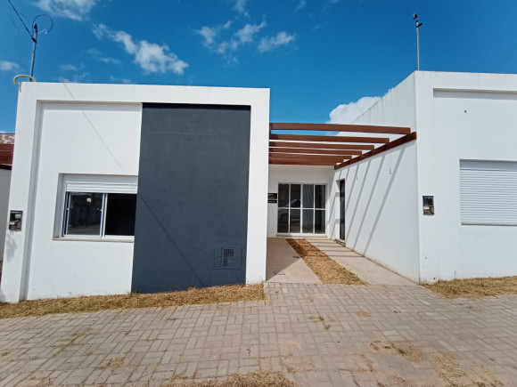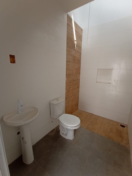 Casa de alvenaria de alvenaria e laje: 02 dormitórios, sala de estar e cozinha com churrasqueira, banheiro social, área de luz, abrigo para carro.