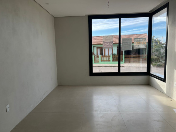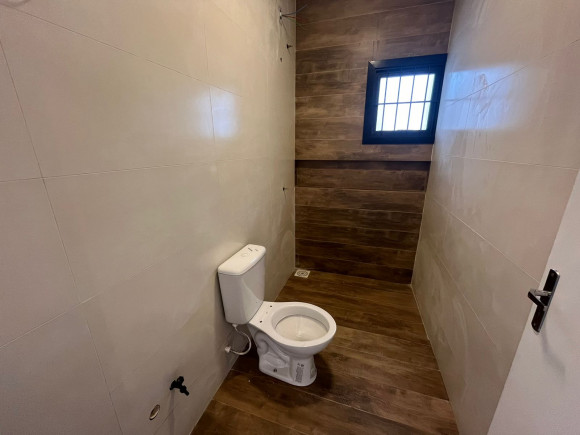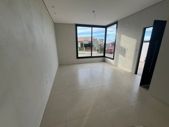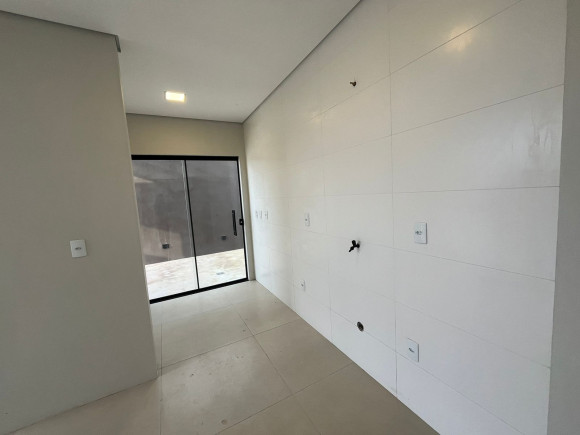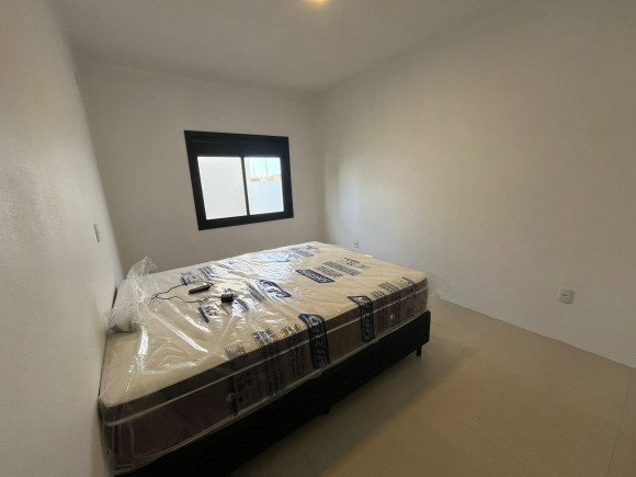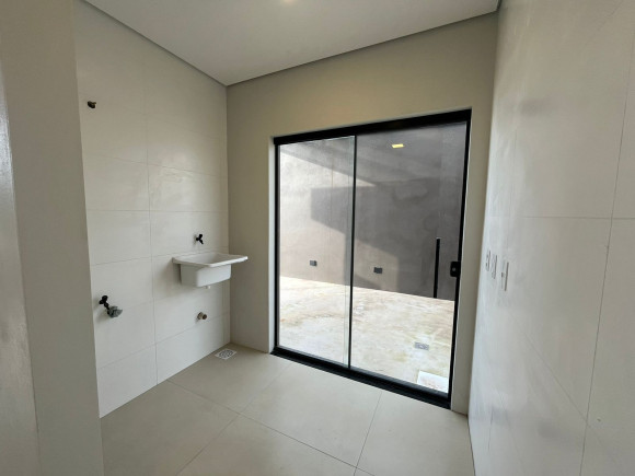 Casa de alvenaria e laje com piso porcelanato e gesso contendo dois dormitórios, sala e cozinha conjugadas, lavanderia e banheiro. Abrigo para carro