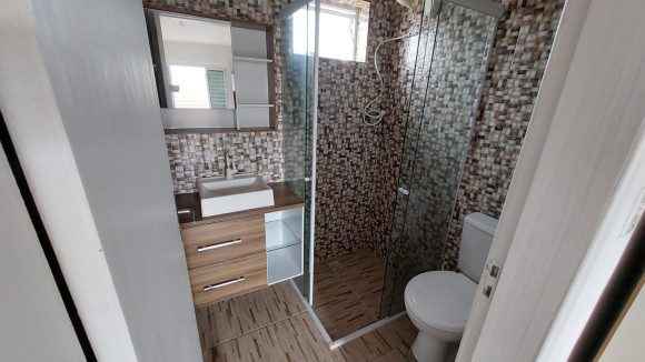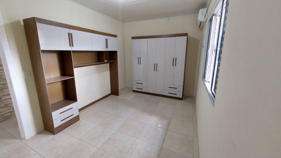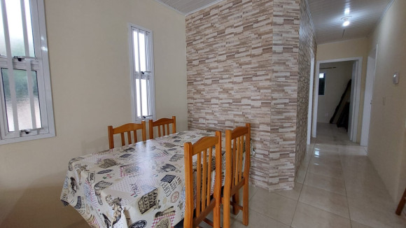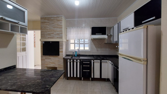 Casa de alvenaria contendo três dormitórios, sendo uma suíte com sacada, sala de estar e de jantar conjugadas, cozinha com móveis planejados e churrasqueira, banheiro social, lavanderia e duas garagens, uma fechada para carro e outra fechada com vidro. Aceita troca.
