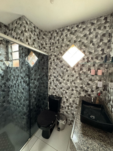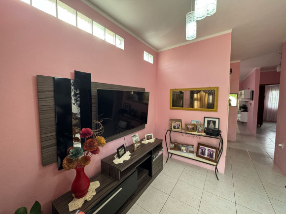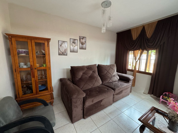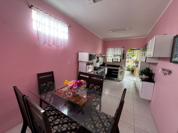 Casa em alvenaria, laje e telhas de barro: sala de estar ampla, cozinha, banheiro, 02 dormitórios, área coberta com churrasqueira e garagem. Fundos: cozinha, 01 dormitório, banheiro com lavanderia (telhado com telhas brasilit). Terreno medindo 8,5m x 32m.