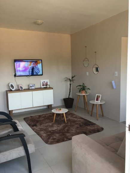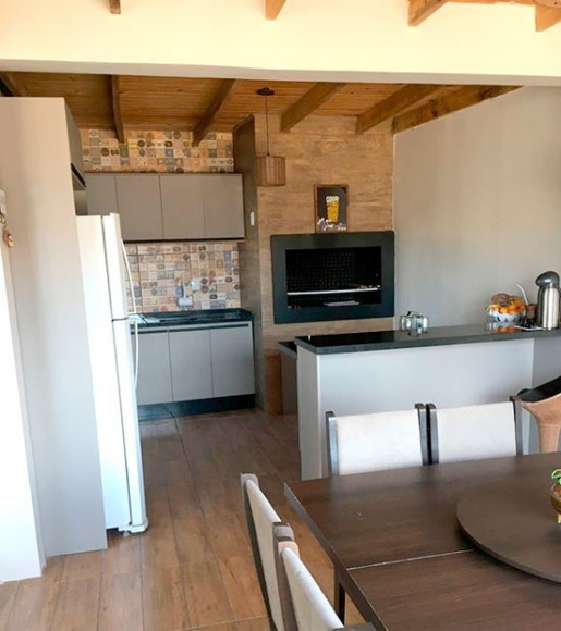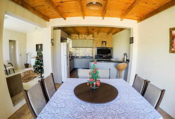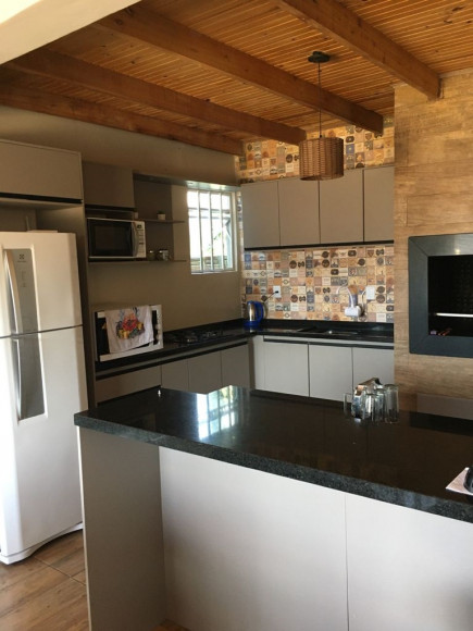 Casa de alvenaria e laje: 02 dormitórios, sala e cozinha com churrasqueira, banheiro social, garagem com churrasqueira e piscina. Obs: aceita terreno no negócio. Excelente posição solar.