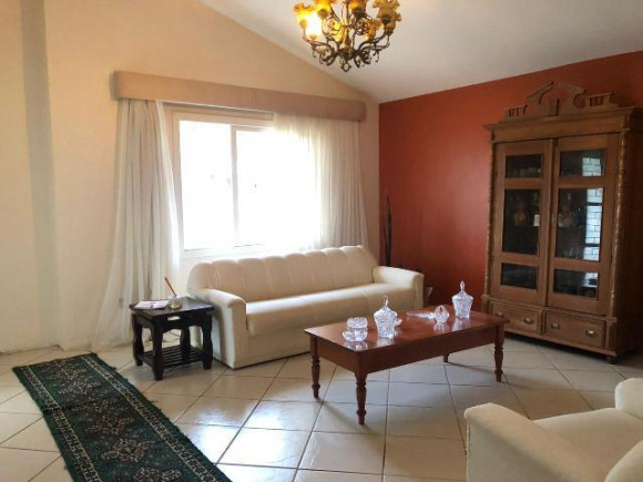 Casa de alvenaria e laje, contendo: 4 dormitórios, sendo 1 suíte, sala de estar e jantar, sala de TV com lareira, banheiro social, cozinha, pátio amplo com piscina, garagem com churrasueira e vaga para 2 carros. Terreno 12x33. Frente Oeste.