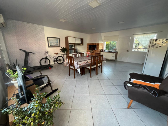 Imóvel com 4 dormitórios sendo 1 suíte, sala de estar, cozinha, banheiro, área de luz e abrigo para carro. Fundos possui salão com churrasqueira, 2 dormitórios, banheiro, despensa e pátio.