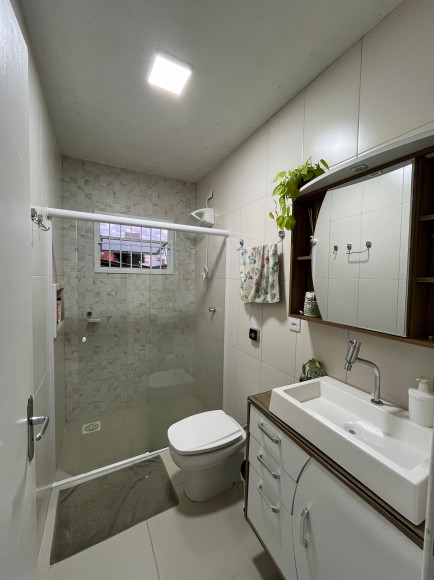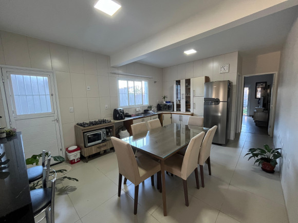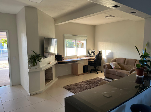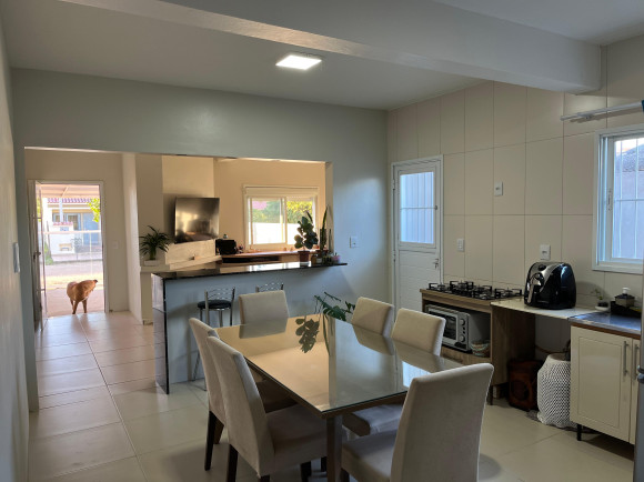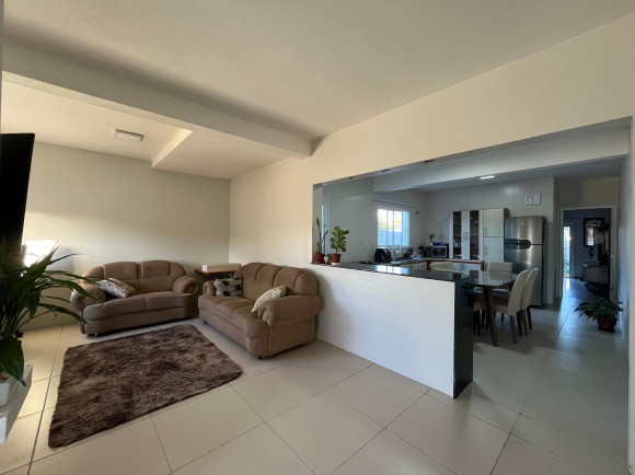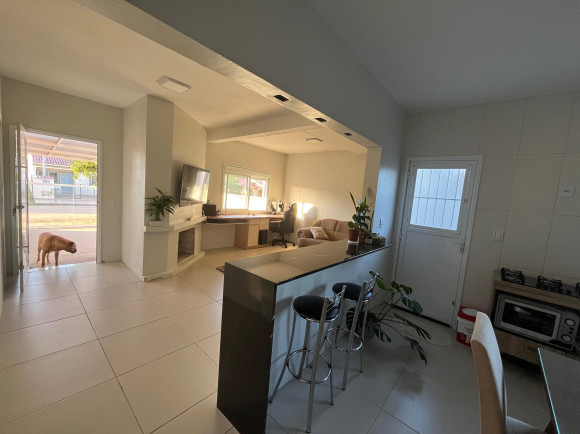 Casa de alvenaria e laje com estrutura para segundo piso, contendo uma sala ampla com lareira e cozinha em conceito aberto, banheiro social , um dormitório e abrigo para o carro.