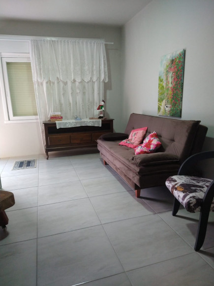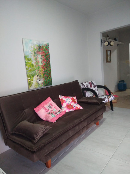 Casa de alvenaria e laje, casa reformada, com 02 dormitórios, sala ampla de 02 ambientes com cozinha integrada, banheiro com box vidro, área externa coberta e com churrasqueira.