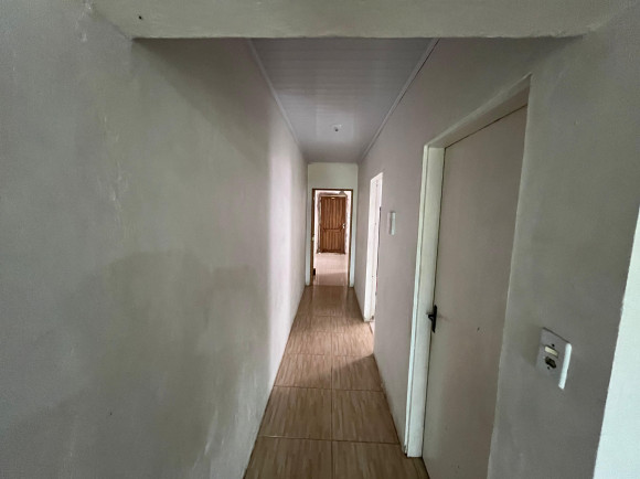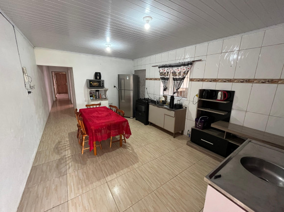 Casa de alvenaria com 123 m² de área construída**, composta por 4 dormitórios, 2 banheiros, sala e cozinha integradas, área com churrasqueira e garagem. Terreno medindo 7 x 30 metros.