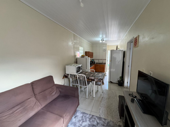 Casa de alvenaria e forro a 3 quadras da praia da barrinha, com 42,80m², contendo sala e cozinha conjugadas, 02 dormitórios e 01 banheiro, com garagem ampla coberta. Terreno com área de 125m² medino 5x25. Frente Leste.