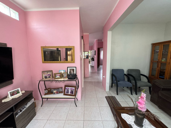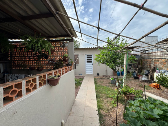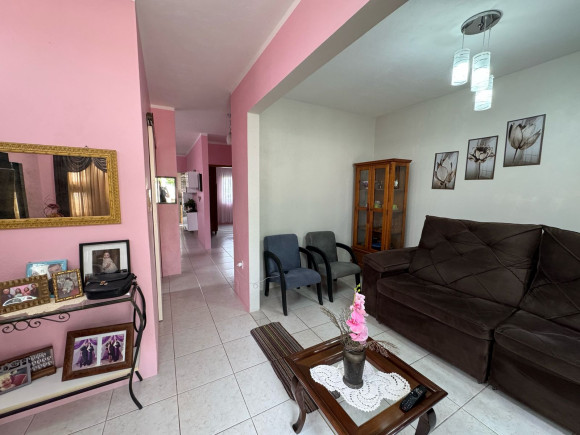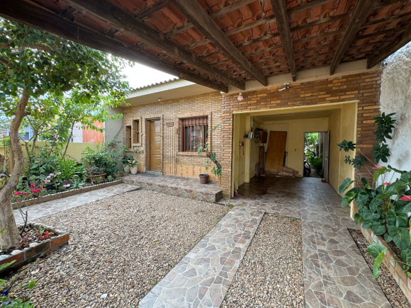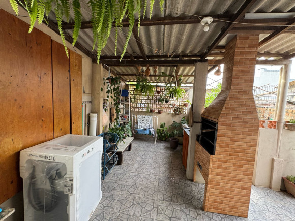 Casa em alvenaria, laje e telhas de barro: sala de estar ampla, cozinha, banheiro, 02 dormitórios, área coberta com churrasqueira e garagem. Fundos: cozinha, 01 dormitório, banheiro com lavanderia (telhado com telhas brasilit). Terreno medindo 8,5m x 32m.