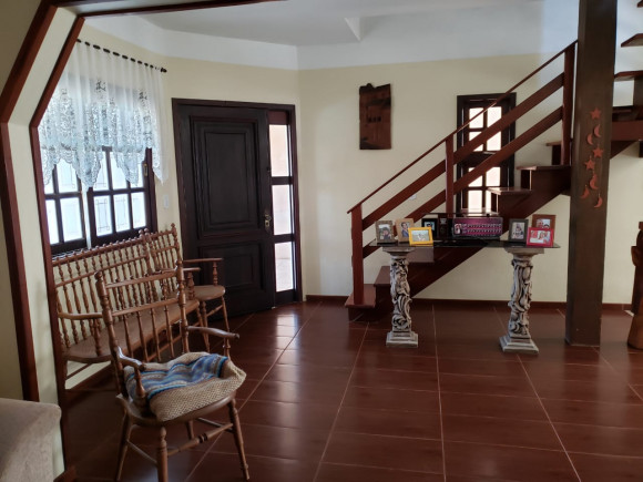 Sobrado de alvenaria laje: Térreo: sala de estar com dois ambientes e lareira, cozinha, escritório (quarto), 01banheiro. 1º Piso: 03 dormitórios amplos, sacada frontal e 01 banheiro. Fundos: garagem fechada, 01 banheiro e um abrigo lateral tudo em alvenaria, frente da casa com piscina e quiosque com churrasqueira e pia, pátio todo calçado.