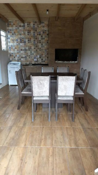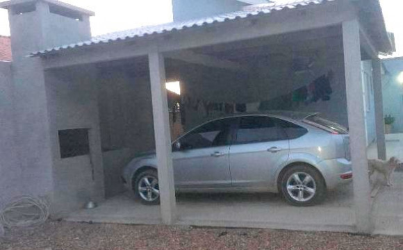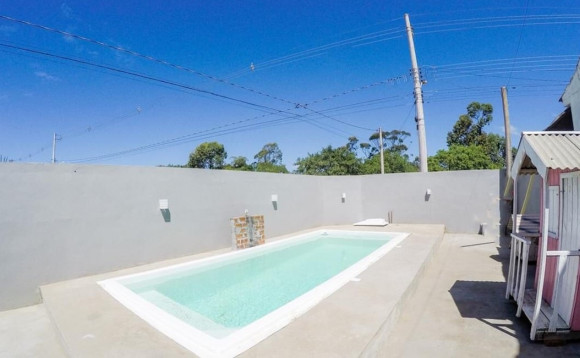 Casa de alvenaria e laje: 02 dormitórios, sala e cozinha com churrasqueira, banheiro social, garagem com churrasqueira e piscina. Obs: aceita terreno no negócio. Excelente posição solar.