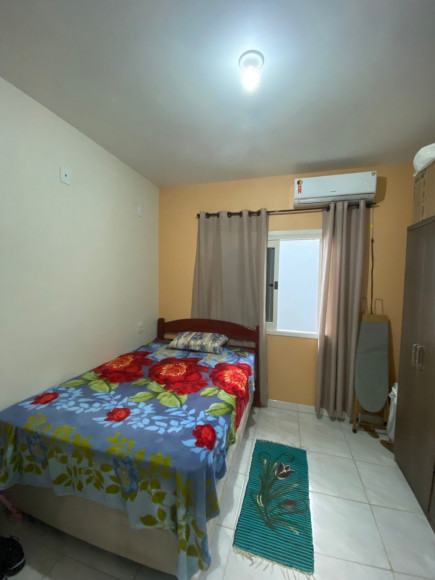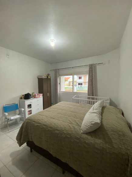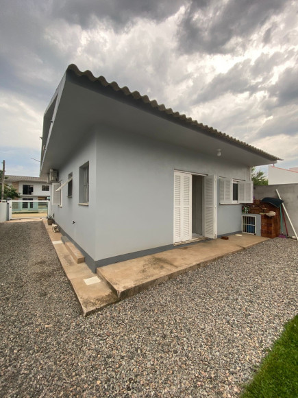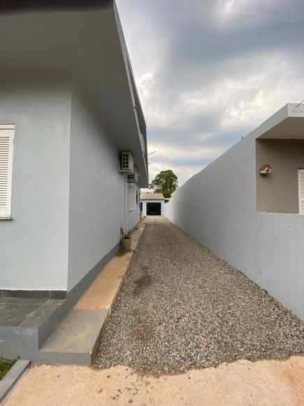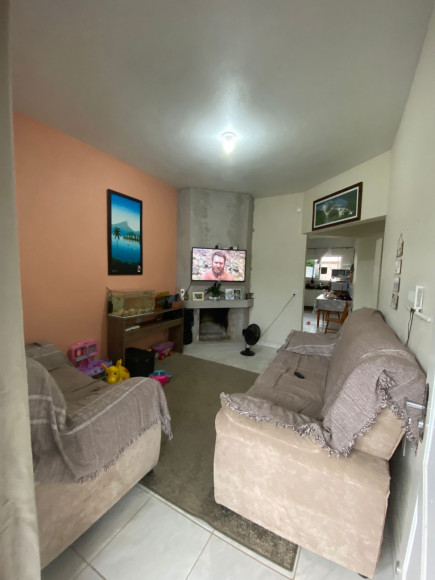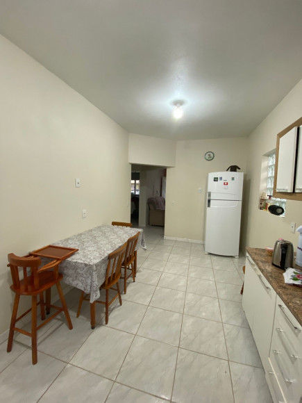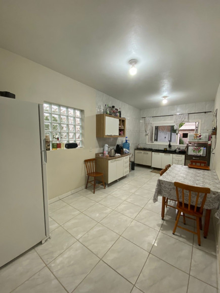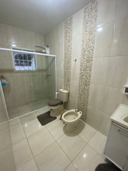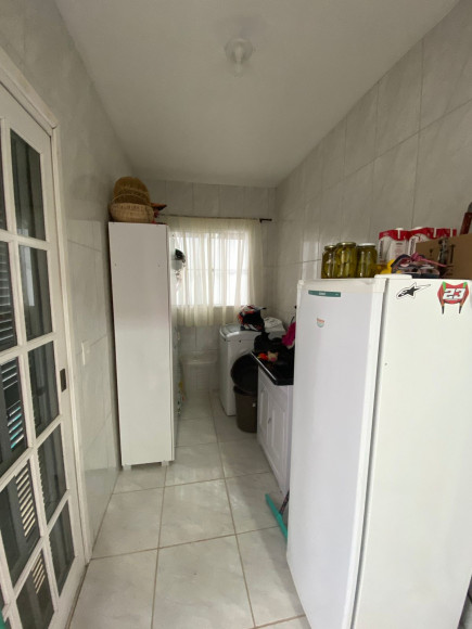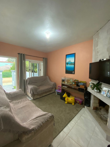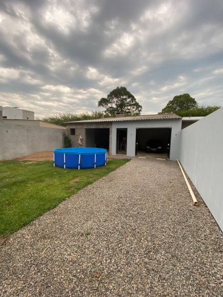 Casa de alvenaria laje: sala de estar com lareira, cozinha ampla, 02 dormitórios, banheiro social com box, lavanderia fechada com área de serviço ampla. Fundos: garagem fechada (porta de vidro) para até 03 carros, com churrasqueira, e banheiro (espaço bem amplo com conceito aberto).