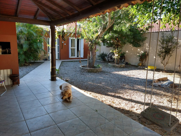 Casa de alvenaria : 02 dormitórios: hall de distribuição de ambientes, sala de estar, sala de jantar, 01 banheiro, área de luz, área de serviço. Quiosque com churrasqueira e pia( projeto de fogão a lenha), garagem fechada. Pátio amplo todo fechado e arborizado .